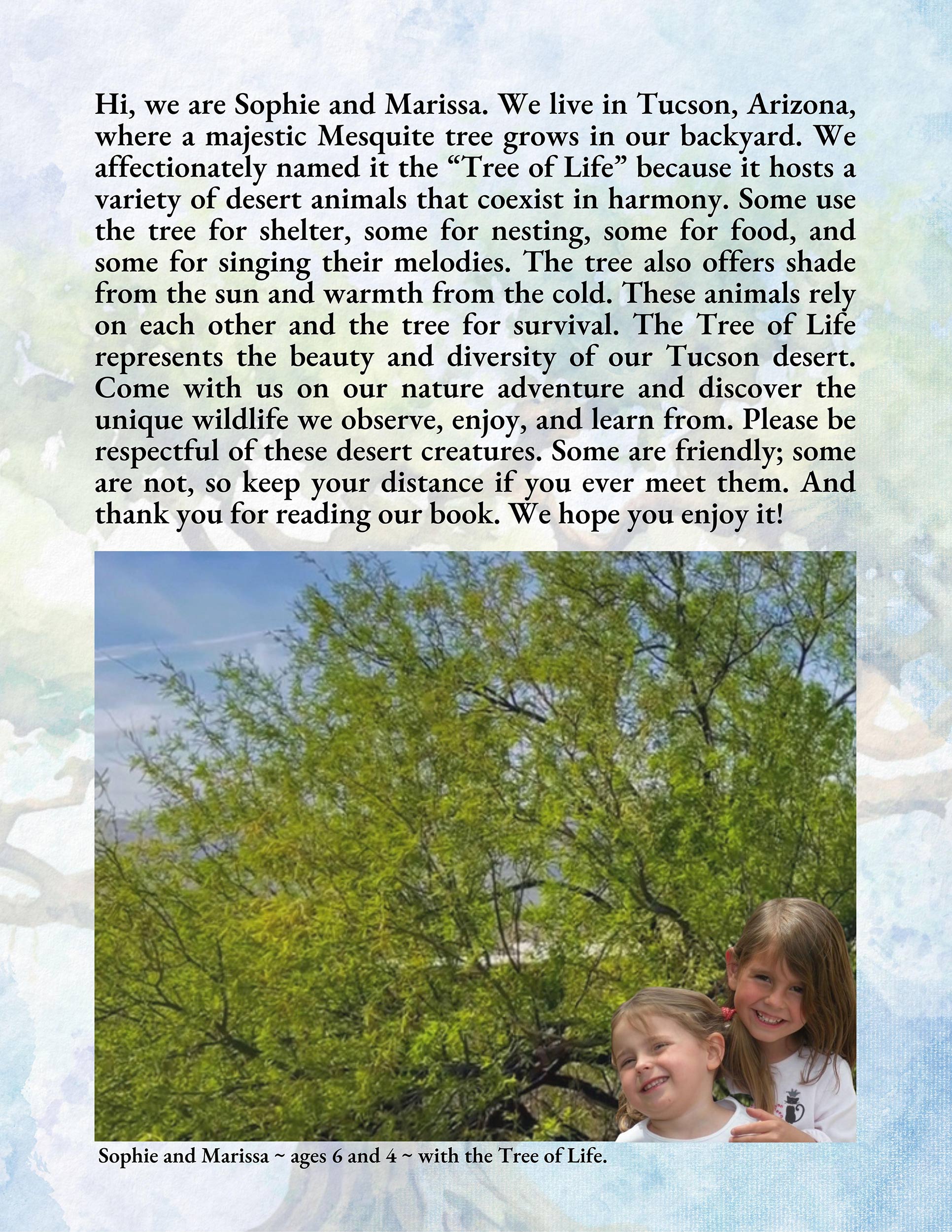 An illustrated children's book celebrating the author's daughters, a majestic Mesquite tree in their backyard, and the beautiful desert creatures in, on, or around the tree.